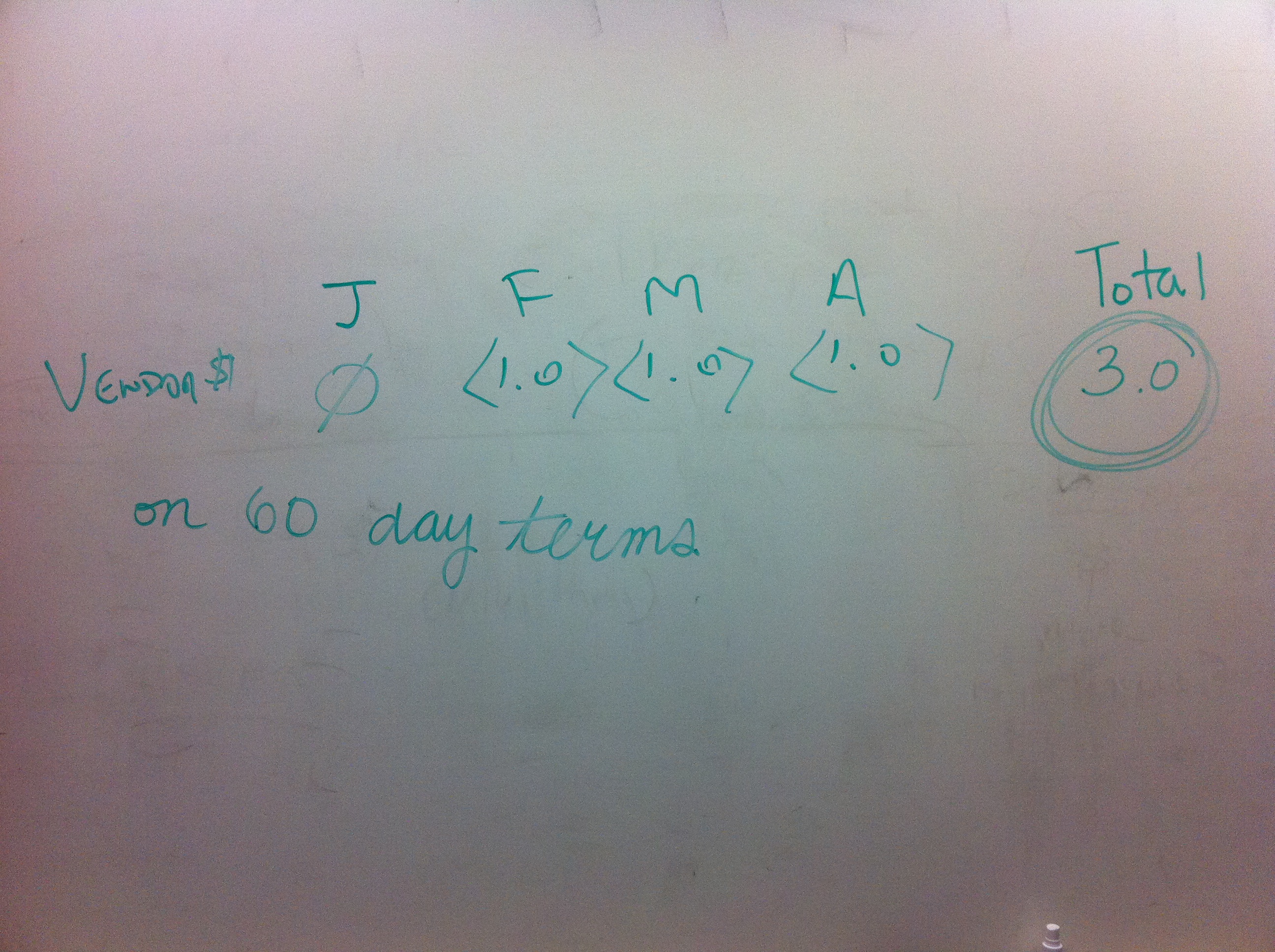 First, let’s suppose that you have 30 day terms with your vendors and a million dollars in payables every month. Imagine that we’re just looking at the first four months of the year, January through April.